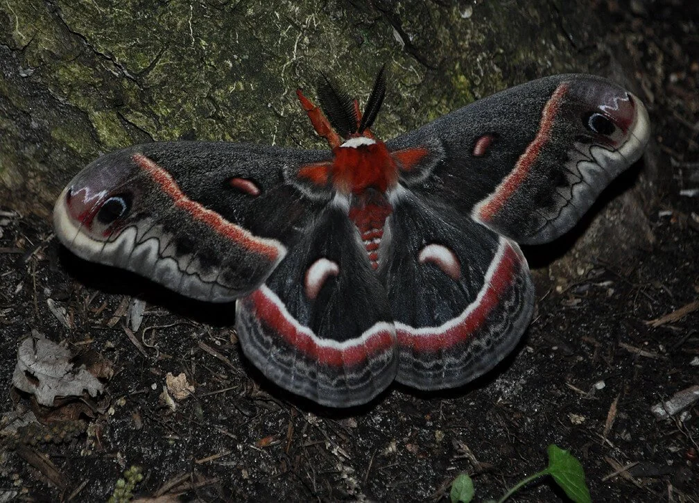 The Cecropia is among the most spectacular of the North American Lepidoptera. It has a wingspan of 4 5/16 - 5 7/8 inches! However, in order to enjoy this beauty, you will have to be outside at night. These nocturnal moths are found in hardwood forests east of the Rocky Mountains in the United States and Canada. They are attracted to street and porch lights, which is where most people encounter them.